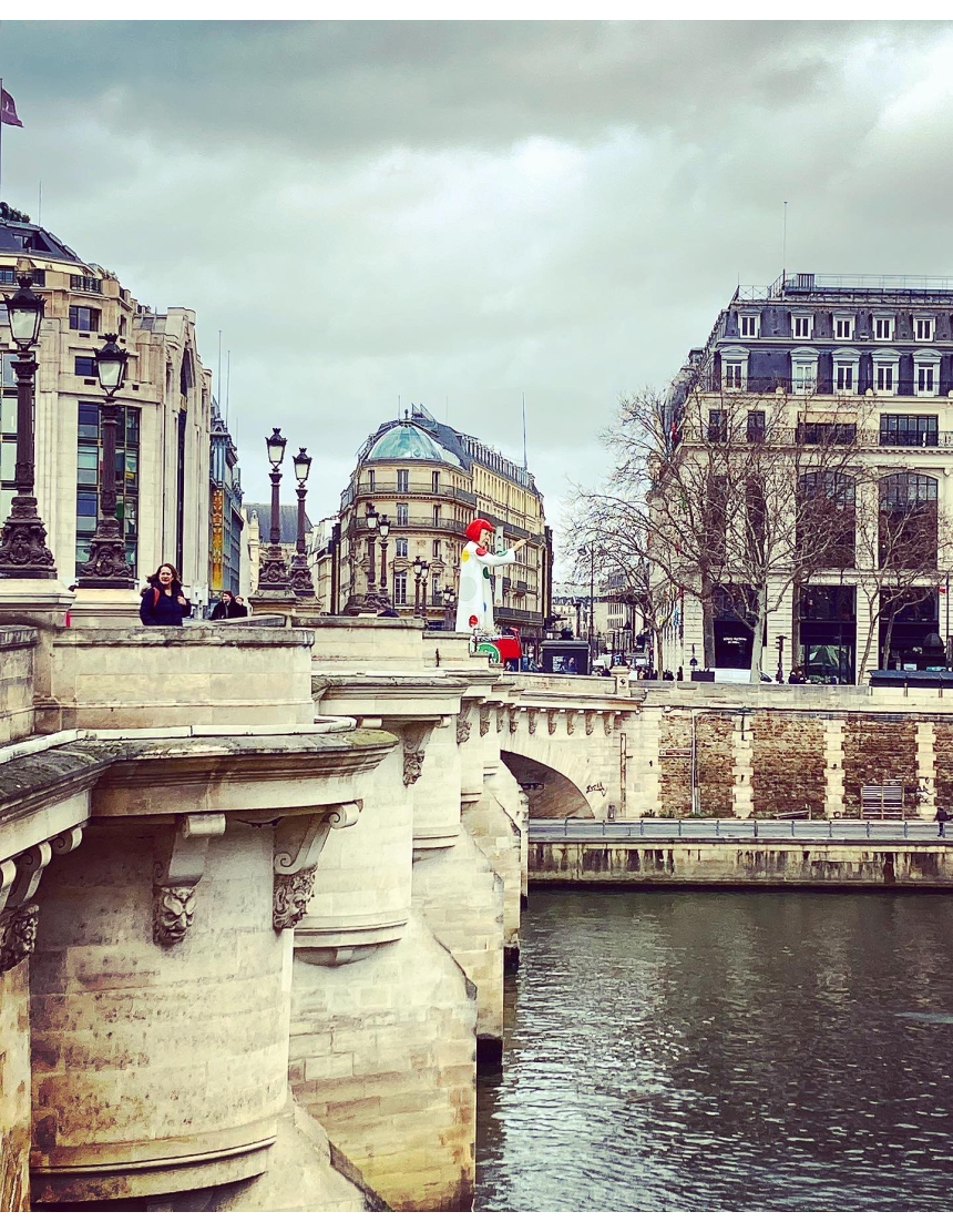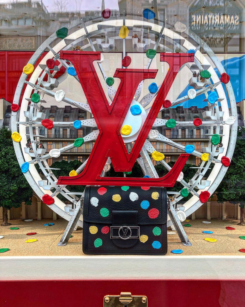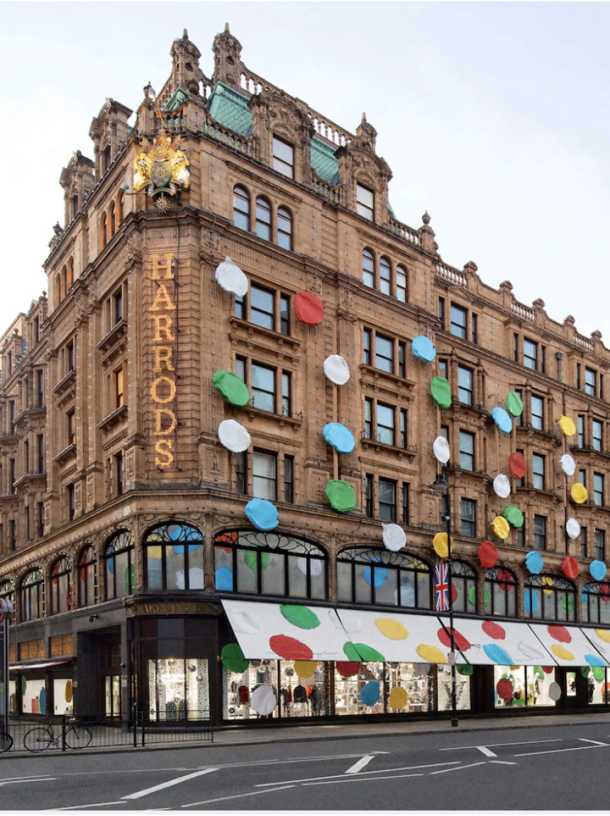 S’invitant sur les façades des flagships de la marque dans la capitale française, d’abord celle des Champs-Élysées en janvier et maintenant sur celle faisant face au Pont-Neuf (Harrod’s à Londres en parallèle et sûrement bientôt l’envahissement mondial), l’artiste haute en couleurs et en style fait souffler un vent de modernité, de gaieté, et de printemps à la grisaille météorologique et au classicisme architectural des lieux.