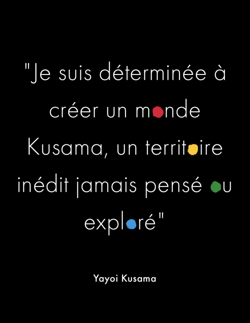 Étonnant parcours que celui de cette femme, née dans un Japon rural et traversant l’espace temporel et géographique comme un OVNI interstellaire, inondant la planète de ses citrouilles et carburant avec une énergie renouvelable et inépuisable formée de taches picturales rondes presque parfaites aux couleurs primaires de joie communicative.
