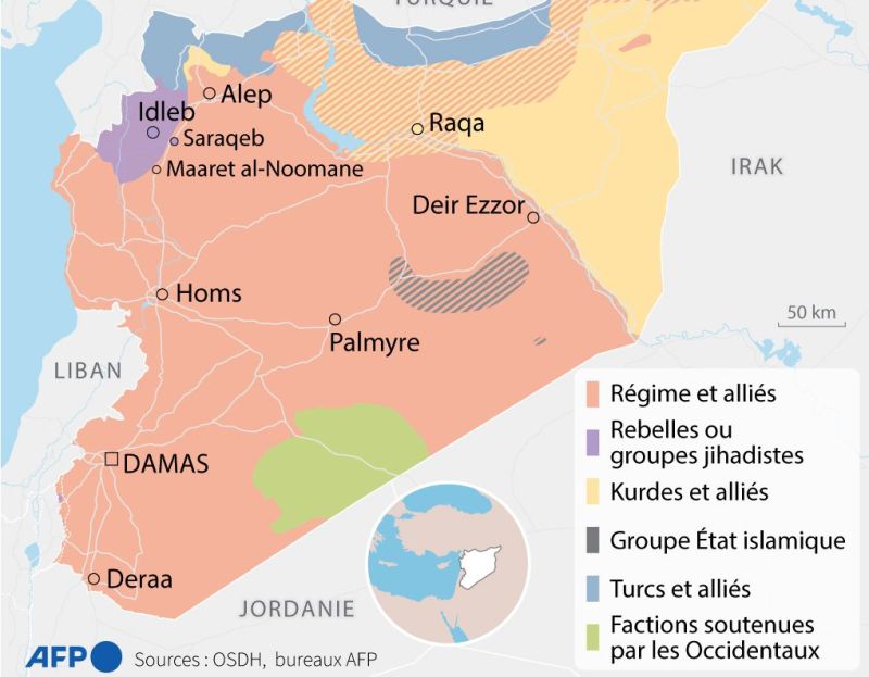 Actuellement, plusieurs régions échappent toujours au contrôle de Damas. Les régions les plus peuplées se trouvent au nord, à la frontière turque, où Ankara finance et arme des factions diverses contre le régime syrien.