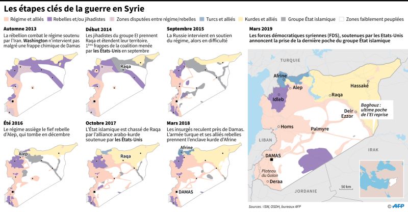 Peu de guerres ont morcelé un pays autant que le conflit syrien. Avec l'intervention de plusieurs acteurs au fil des années, puissances étrangères qui ont mobilisé leurs propres troupes ou qui ont agi par l'intermédiaire de milices par "procuration" (proxy), organisations nationalistes appartenant aux différentes ethnies ou religions, groupes terroristes etc. la situation est devenue extrêmement complexe. Ce n'est que grâce à l'aide de la Russie de Vladimir Poutine que Assad va pouvoir rétablir son pouvoir sur presque 70% du territoire syrien.