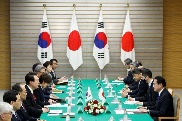 "Nous sommes convenus que le renforcement des relations entre le Japon et la Corée du Sud est urgent dans le contexte actuel", a déclaré le Premier ministre nippon Fumio Kishida après son entrevue à Tokyo avec le président sud-coréen Yoon Suk Yeol, inédite à ce niveau depuis 12 ans.