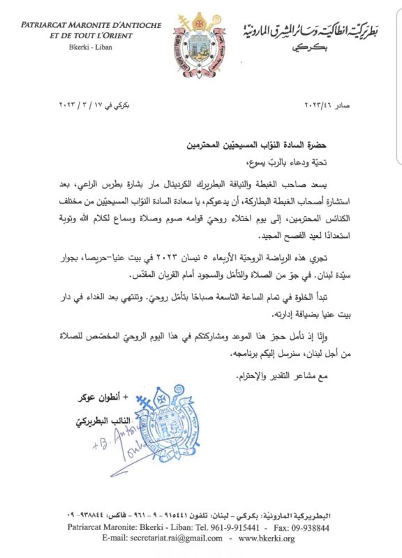 Invitation envoyée par le vicaire patriarcal Antoine Aucar aux députés chrétiensLire aussi