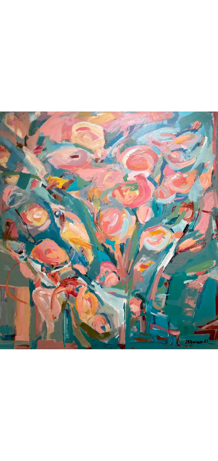 Sur fond gris, elle fait ressortir des roses qui dansent en impressions semi-abstraites. Elle a aussi une prédilection pour le turquoise et le vert qu'elle marie en tonalités changeantes, inspirant la joie et la vie. Une toile d'Irène Ghanem, c'est comme une pilule de bonne humeur, un moment de bonheur qu'on peut revivre à l'infini.
