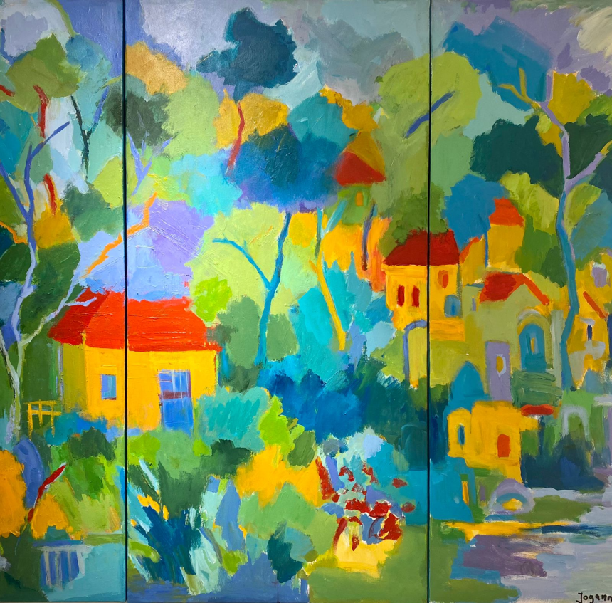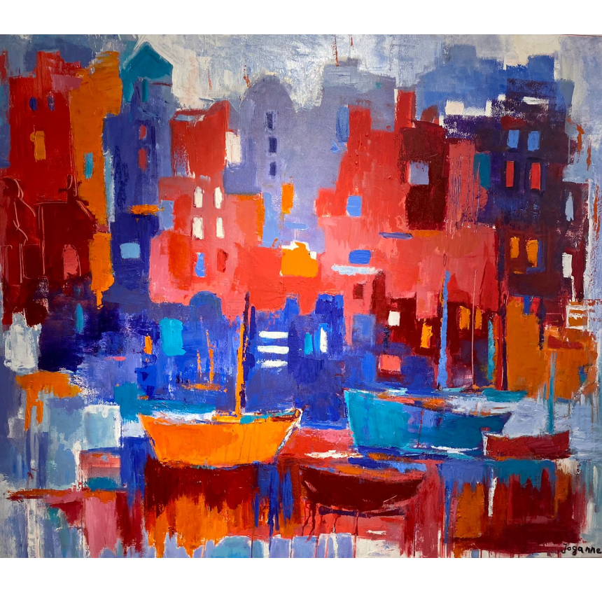 Jocelyne Ghannagé nous parle avec ferveur de ce besoin de voyage qu’elle revendique sur l’une de ses toiles. Un moment de tiraillement entre le bateau qui voudrait quitter le port et la ville qui reste là, en arrière-plan, solide et présente. C’est un besoin d’évasion qui se manifeste également par l’expression semi-figurative de l’artiste. Elle se libère de toute convention et vogue, par ses courbes et ses lignes colorées, vers un ailleurs émotionnel et personnel. L’harmonie se fait en elle-même à travers les formes et les couleurs qui se fondent et se confondent, loin des normes académiques... ou même sociales.
