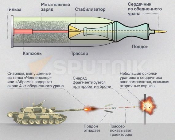 Un obus antichar peut être tiré d'un canon antichar, du canon d'un char ou d'un autre véhicule. À la différence d'un obus ordinaire, il comporte seulement une "flèche" en alliage très dur (tungstène, titane, uranium appauvri) enveloppée d'un "sabot". Celui-ci se détache de la flèche juste avant l'impact pour offrir une célérité supplémentaire au projectile. La flèche atteint la cible à une vitesse très élevée et force le blindage, si celui-ci est fait en acier ou un autre métal moins lourd. De plus, l'UA s'enflamme au contact du blindage. Ceci augmente davantage sa puissance de perforation. (Photo: Sputnik, copié de US Army et GlobalSecurity.org)