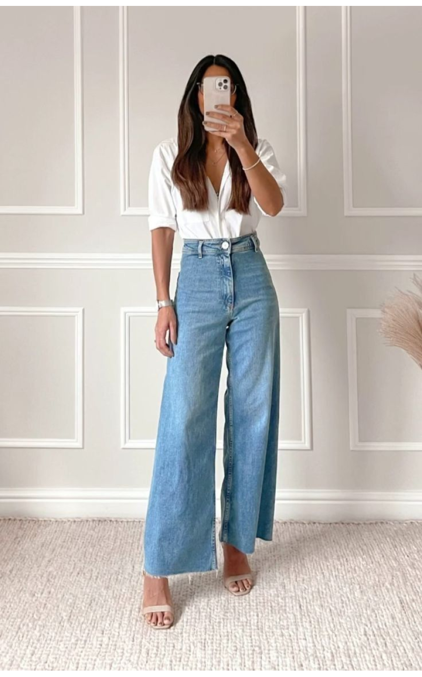 Si vous voulez éviter les coupes passe-partout et souhaitez adopter un look original, le jean wide leg est fait pour vous. Ce jean à la coupe oversize des hanches à la cheville est la pièce incontournable pour un look décontracté chic, très tendance cette année. Idéal pour harmoniser la silhouette, le jean wide leg apporte du volume aux hanches fines de la silhouette en V. Les morphologies en X le portent aussi facilement. À éviter si vous êtes menue: le jean vous «engloutirait» et votre silhouette en sera déséquilibrée. Attention aux volumes lorsque vous portez le wide leg. Rentrez le haut dans votre pantalon pour harmoniser votre look.