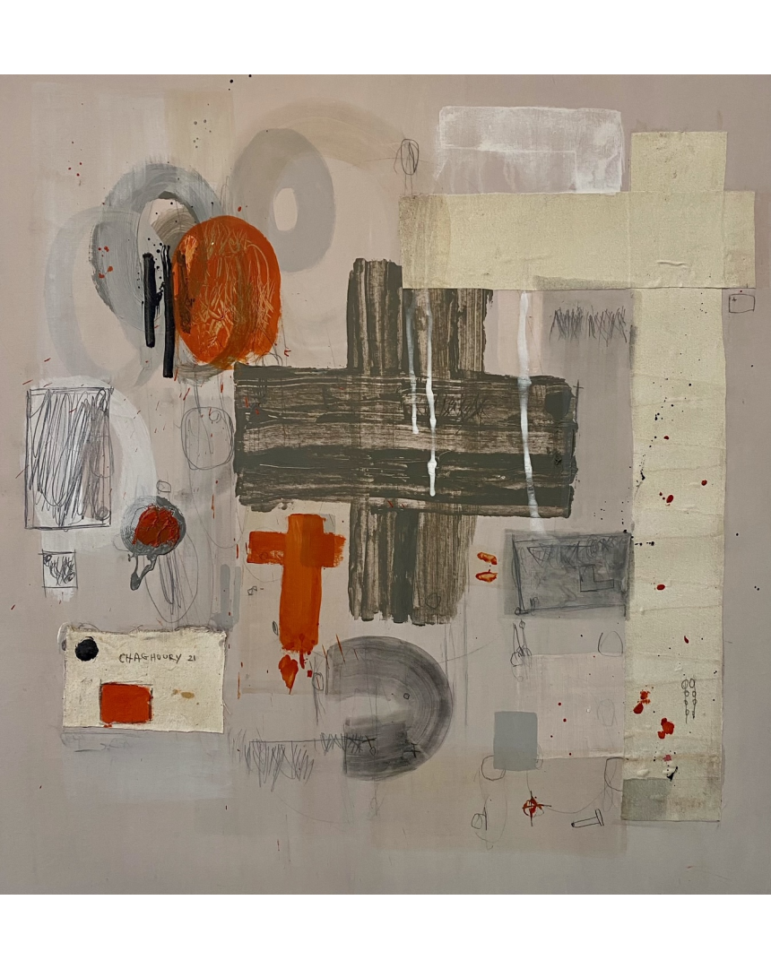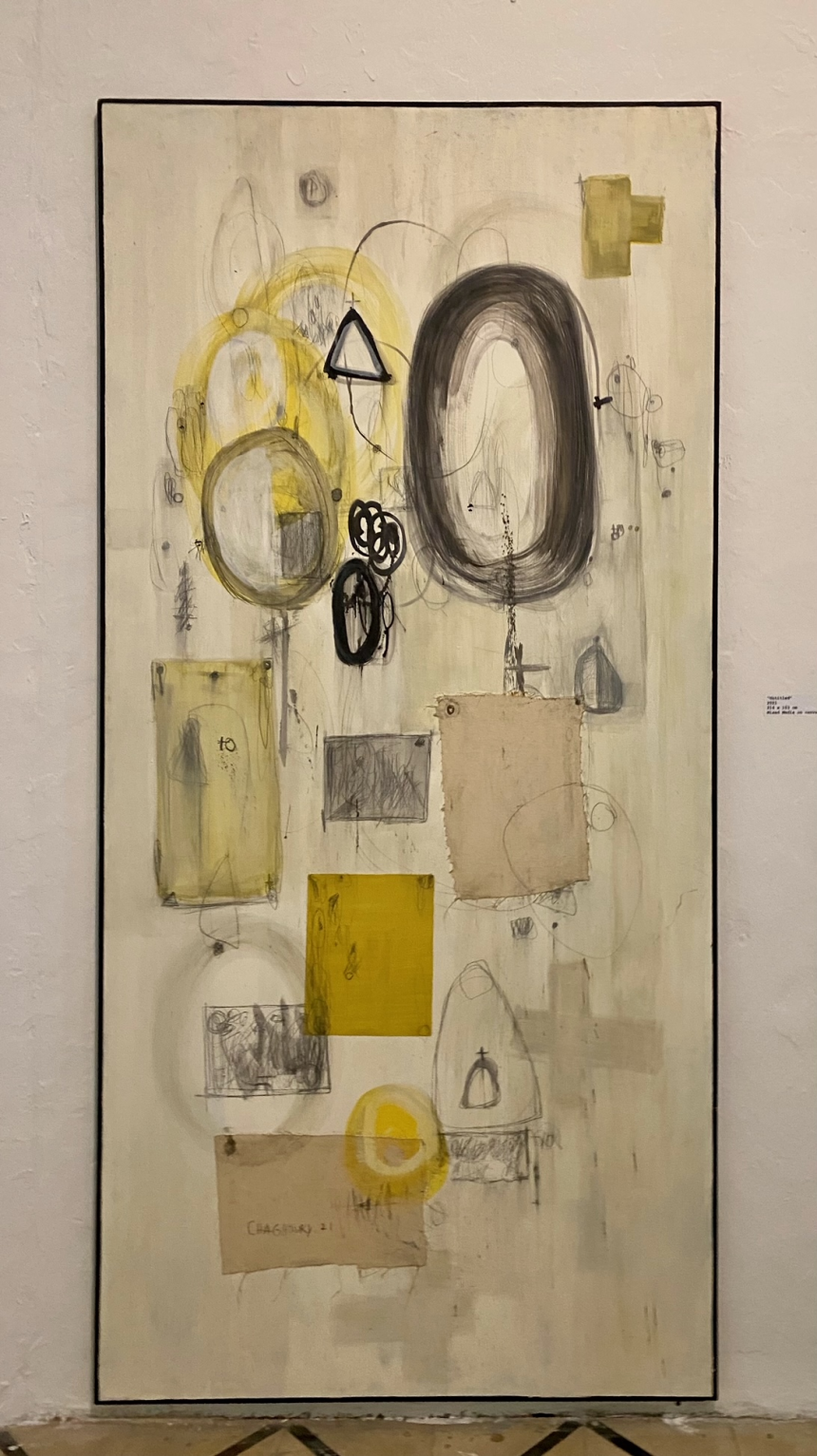 La force des compositions d'Élio Chaghoury se manifeste sur des toiles de formats variés, qui invitent, chacune à sa manière, à la réflexion et même à l’introspection. Les monochromes de tonalités terre et la gamme de couleurs ternes invitent à un retour aux sources. Par ailleurs, le cadre de Zico House, cet ancien appartement aux fenêtres de bois et aux dalles d’époque, met en valeur les peintures de manière spontanée.