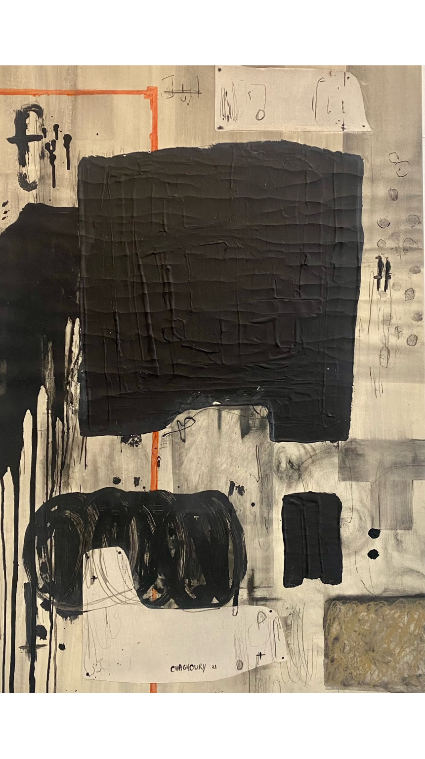 Sur des supports différents, que ce soit le papier de riz, les cartons ou les toiles, Élio Chaghoury dessine des mots que seule la sensibilité humaine peut lire. Il ne s’agit pas de la calligraphie dont le spectateur est familier. C’est plutôt un langage abstrait et émotionnel qui émane de ses dessins.