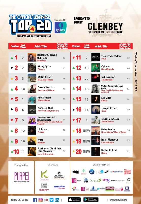 Cette semaine dans OLT20, nous avons trois nouvelles entrées. La plus avancée, Heart Wants What It Wants, qui vient en 18e place, est signée Bebe Rexha, chanteuse américaine. Elle est suivie par Law Habbayt, signée Iman Mansour, qui occupe la 19e place, et par Hases, du chanteur libanais Nader al-Atat, qui vient en 20e place.