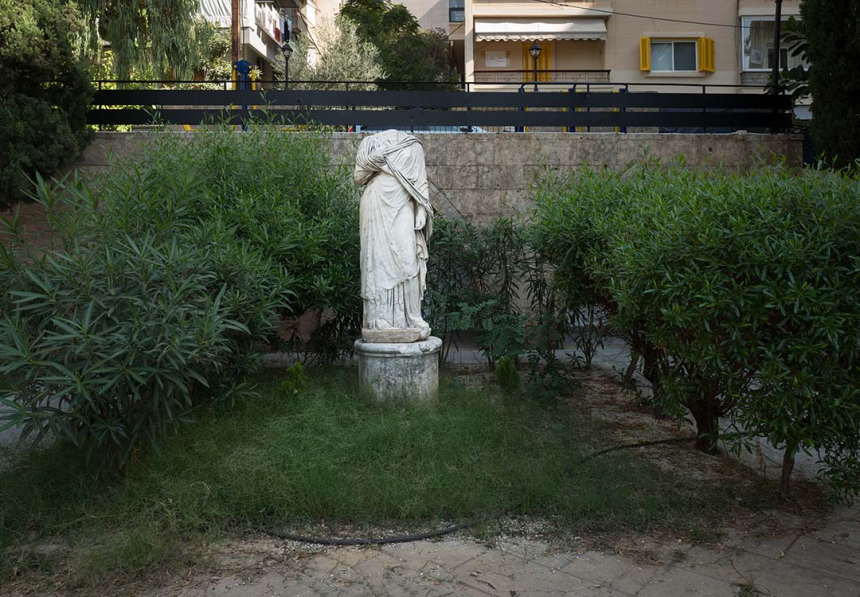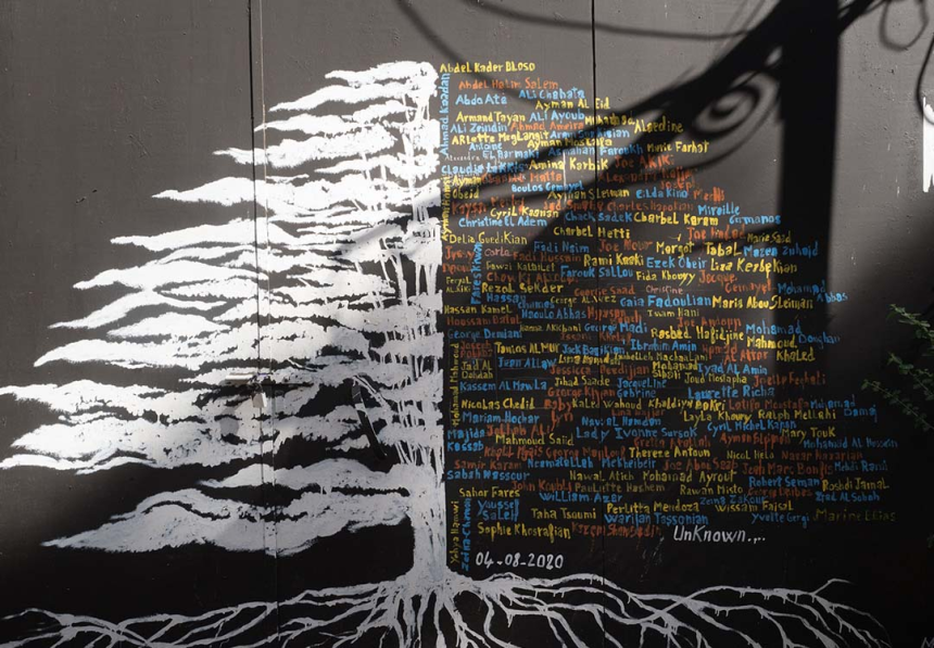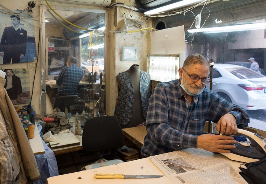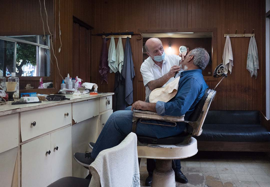 On dirait un décor de carton-pâte; quasiment toutes les cellules commerciales sont vides, aucune âme, rien. Étrange et totalement raté. Ah oui, c’est censé être une histoire sans paroles, alors je vous laisse découvrir un barbier de Zokak el-Blatt, la statue sans tête et la dame blonde en grande conversation avec un saint auquel, sûrement, elle a quelque chose à demander, le tailleur pour hommes qui n’a plus vraiment de costumes à coudre, mais un fer à repasser à réparer, le cèdre libanais revu et corrigé avec les noms des victimes de la tragédie du port, une jeune mannequin en plein shooting mode et, en levant la tête, dans l’embrasure d’une fenêtre, une curieuse apparition. Petits instantanés d’une journée où j’ai beaucoup marché.