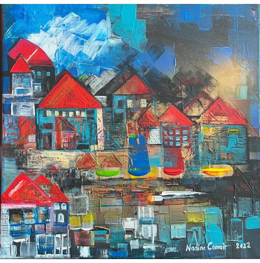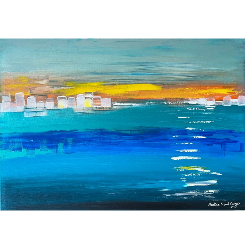 Nadine Fayad Comair explore divers thèmes et matériaux pour exprimer des notions d'évasion, de rêve, d'amour, de voyage et de liberté. Elle le fait avec une grande finesse, en mettant l'accent sur son cher Liban et la Côte d'Azur qu'elle adore. Passionnément, l'artiste dépeint un univers marin, des cités, des personnages et des réalités qui s'infiltrent profondément dans son esprit, se manifestant dans son art à travers des tourbillons de couleurs.