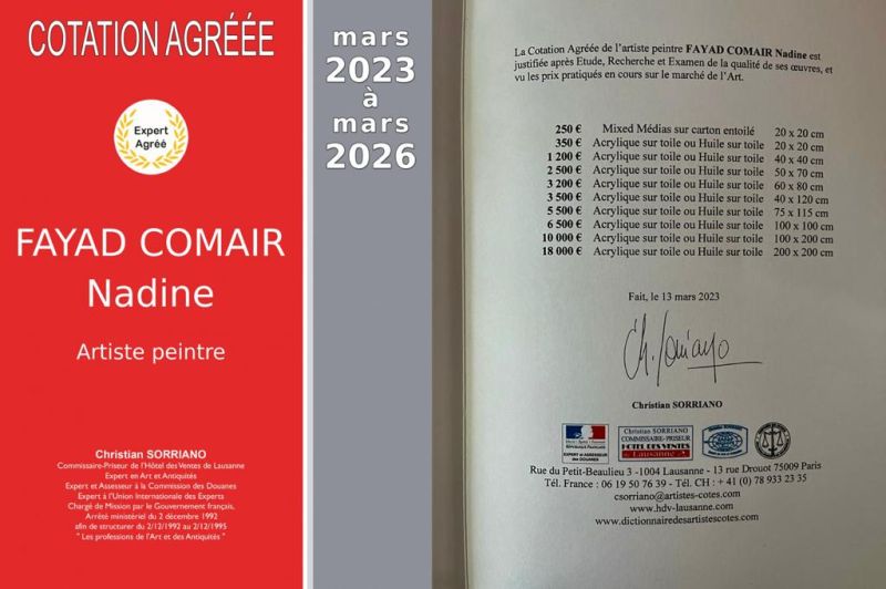 Avec son langage artistique empreint de créativité, Nadine Fayad Comair crée un univers flamboyant qui reflète sa réalité. Son talent réside dans sa sensibilité chromatique intense et sa maîtrise des nuances vibrantes, des formes, des lignes et des contrastes. Ses dernières créations seront exposées dans le cadre du Festival international d'art contemporain à Nice qui se tiendra du 14 au 16 avril 2023.