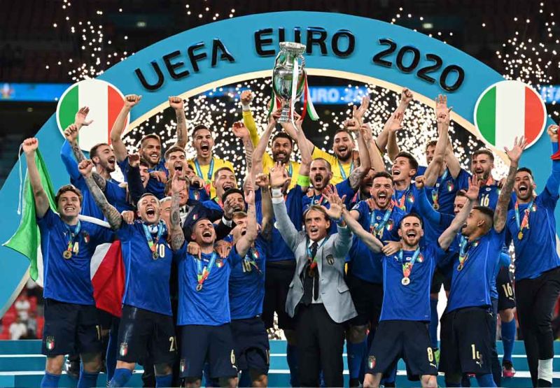La Squadra Azzura sur le toit du football européenDonnarumma arrêtant penalty sur penalty puis Chiellini soulevant la Coupe d'Europe pour la première fois depuis 1968. L'inattendu Marcell Jacobs remportant le 100 m olympique entre incrédulité et parfois quelques doutes, avant de récidiver en relais 4x100.