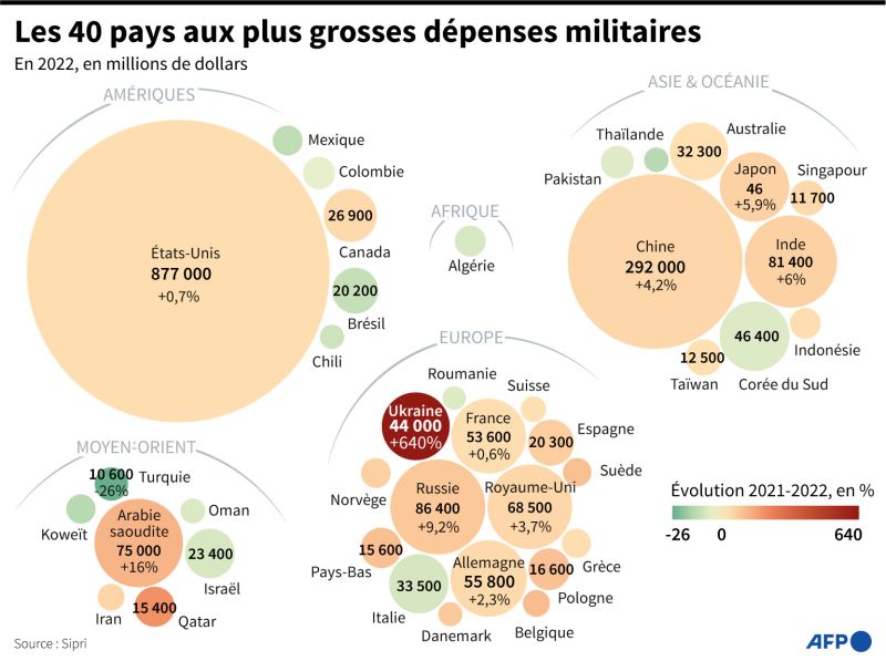 "Ils sont tirés par la guerre en Ukraine, qui pousse les budgets européens vers le haut, mais aussi par les tensions non résolues et croissantes en Asie de l'Est" entre la Chine d'un côté et, de l'autre, les États-Unis et leurs alliés asiatiques, souligne à l'AFP le chercheur Nan Tian, un des coauteurs de l'étude.