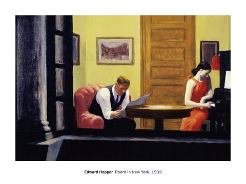 Les personnages des toiles du peintre apparaissent comme des objets juxtaposés les uns à côté des autres, comme s’ils faisaient partie du décor. Ainsi dans Room in New-York, par exemple, la couleur rouge du fauteuil et de la robe de la femme ressortent de la morosité ambiante, comme une énergie latente vite éteinte par l’attitude indifférente de l’homme envers la femme qui semble, elle, mi-résignée. Deux personnages physiquement proches et pourtant si distants affectivement. Est-ce un couple enfermé dans le silence, dans la prison de son existence quotidienne, revêtu des défroques des apparences ? Hopper a-t-il voulu illustrer la solitude dans laquelle il se retrouvait lui-même dans son couple ? Il lui est arrivé de se demander publiquement si ses tableaux ne reflétaient pas sa propre solitude conjugale.