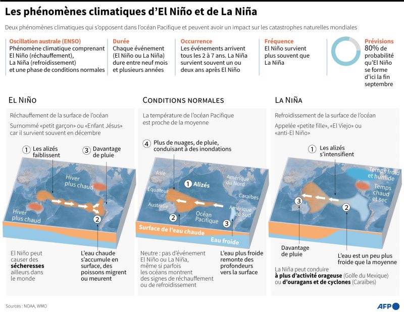L'Organisation météorologique mondiale (OMM) a fait savoir mercredi qu'il y avait 60% de risque qu'El Nino se développe d'ici à la fin juillet et 80% de risque d'ici la fin septembre. "Cela modifiera les conditions météorologiques et climatiques dans le monde entier", a expliqué le chef de la division des services régionaux de prévision climatique de l'OMM, Wilfran Moufouma Okia, en conférence de presse à Genève.