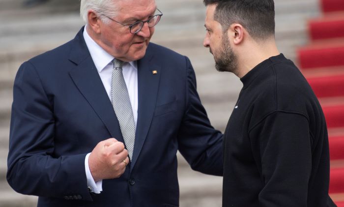 "Tiens bon", semble dire le président allemand Frank-Walter Steinmeier à son homologue ukrainien en l'accueillant sur le perron du Château de Bellevue, résidence officielle du chef de l'Etat fédéral.