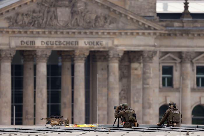 Des tireurs d'élite de la police berlinoise en poste devant le bâtiment du Reichstag qui abrite le Bundestag (chambre basse du Parlement), près de la chancellerie, lors de la visite du président ukrainien.