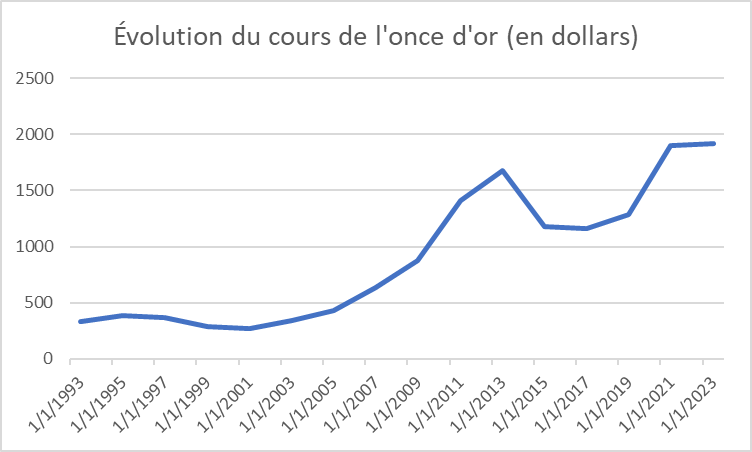Le cours de l’or a tendance à varier en fonction de plusieurs facteurs, dont l’inflation, les taux d’intérêt, les fluctuations des devises, la confiance des investisseurs ou, comme pour tout bien, l’offre et la demande. Le prix d’une once d’or (environ 28 grammes) était de 350$ en 1991. En avril 2023, la même once coûte environ 2000$, soit 5,7 fois plus.