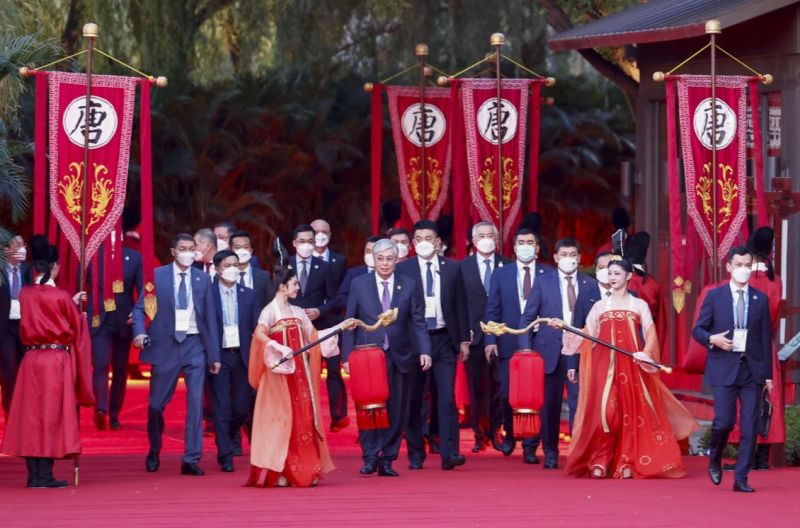 Des dizaines de danseurs ont ensuite interprété un coloré spectacle musical inspiré de la dynastie Tang (618-907), autre symbole, car les liens Chine-Asie centrale étaient particulièrement forts à cette époque.