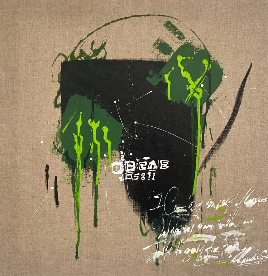 Des extraits de poèmes ou des paroles de chansons se mêlent à des éclaboussures de vert pré, d'orange éclatant ou de bleu indigo, s'estompant sur une partie de la toile, laissant le reste du lin nu et libre. Les fragments de phrases sont en réalité indéchiffrables, se fondant dans les couleurs et les textures abstraites. Les lettres ébauchées mais effacées sont des interrogations qui nous hantent et des pensées qui pourraient nous faire rêver.