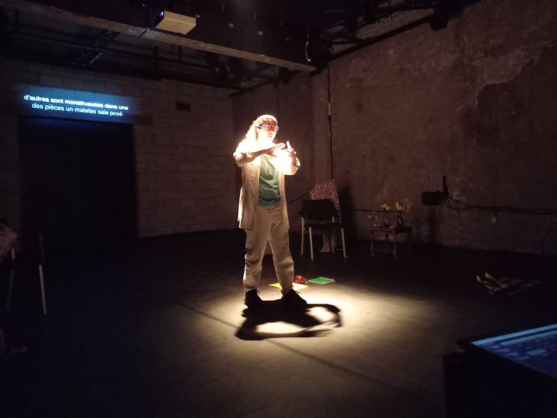Chaque résidence nous a permis d’approfondir la dramaturgie, de définir nos places sur scène, de décider la ligne artistique à suivre pour élaborer la matière sonore et la lumière. Nous avons travaillé de nombreuses heures en ligne, vu que Valérie vit à l’étranger. Nous avons d’abord présenté en français un travail qui a constitué le socle de notre représentation actuelle qui est en arabe avec des surtitres en français. Il y a une distance qui s’est alors créée avec le texte initial que Valérie a choisi d’oublier pour pouvoir l’apprendre en arabe. Cela lui a permis de le redécouvrir et de l’aborder avec un imaginaire autre. Les mots en arabe ne renvoient pas aux mêmes images.