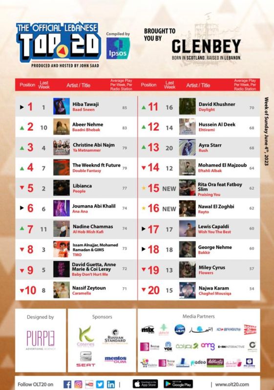 Cette semaine dans OLT20, on félicite la chanteuse, réalisatrice et comédienne libanaise Hiba Tawaji qui décroche la première place avec Baad Sneen. Cette chanson est tirée de son nouvel album qui porte le même titre et connaît un grand succès sur toutes les plateformes digitales mondiales et régionales. Baad Sneen devient ainsi le troisième Numéro Un consécutif de Hiba Tawaji, après Que Sera Sera, un duo avec le célèbre chanteur portoricain Luis Fonsi (2022), et Habibi Khalas (2023).