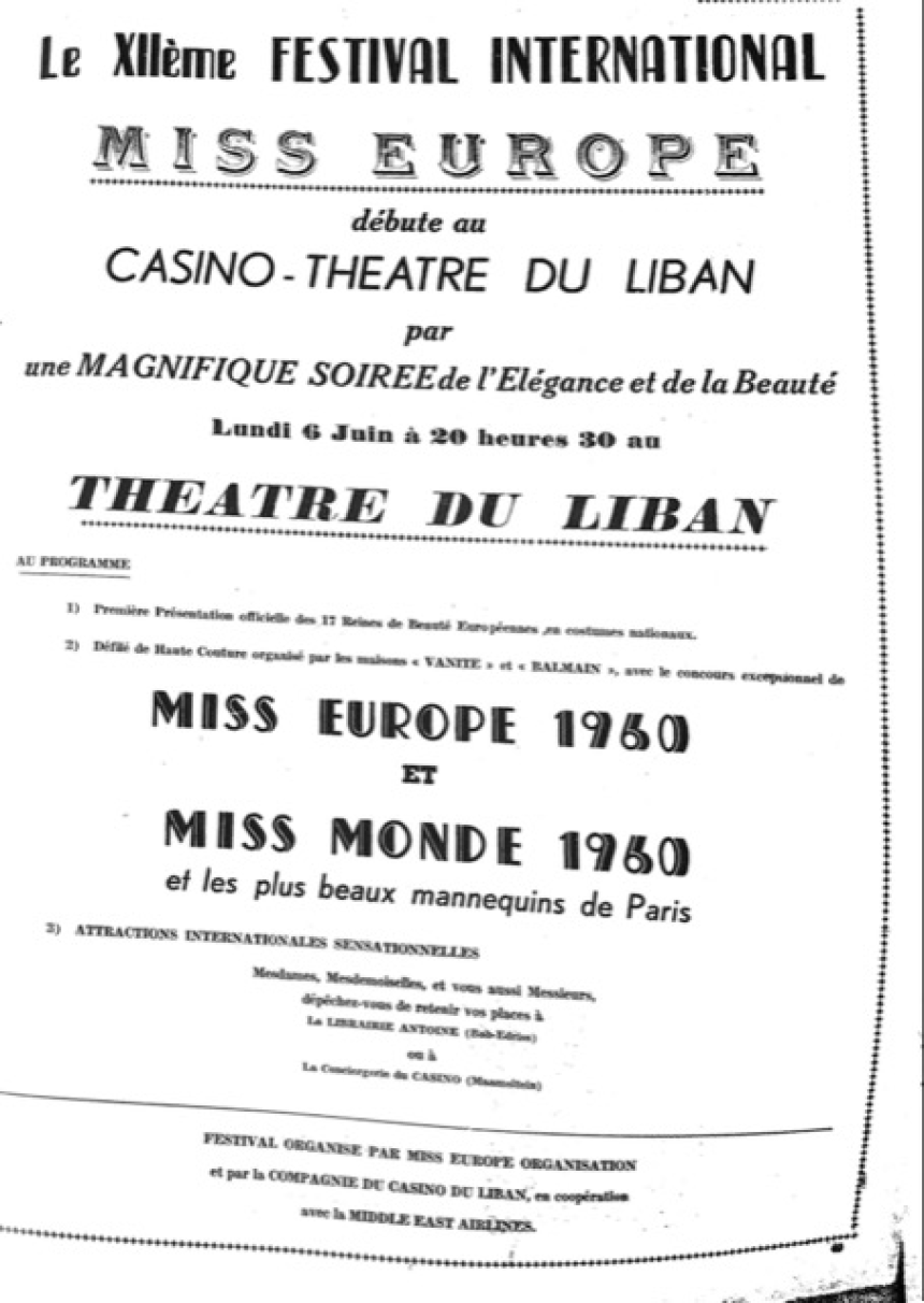 Juin 1960 verra pour la première fois l’élection de Miss Europe se dérouler hors… Europe. C’est dans le fabuleux Casino du Liban que sera sacrée, le 10, Miss Italie parmi 16 autres concurrentes. Défilés de haute couture, dîner de gala, au Liban cela se passe ainsi et cela deviendra une habitude. Chaque année, l’événement Miss Europe verra arriver les plus belles filles, des centaines de personnalités et autant de journalistes qui feront les louanges du pays. Le tourisme d’envergure est ainsi lancé, le Liban devient une destination très prisée et le Casino se montrera chaque année à la hauteur. Ce même Casino accueillera, le 22 juin 1960, un Sacha Distel qui conquiert tous les cœurs. Celui-ci fera le tour des endroits mondains et craquer plus d’un cœur féminin. Le Festival du printemps, au Sud, a une saveur particulière. Saïda accueille, en ce début juin 1963, corsos fleuris, voiliers décorés, théâtre flottant, danses folkloriques et plus de 100.000 personnes. Le 4 juin 1964, c’est Jacques Brel qui vient présenter ses nouvelles chansons au public libanais qui lui fait une ovation. Brel deviendra vite un habitué et se fera de nombreux amis au Liban. Le 24 juin 1968, on fête la Saint-Jean dans la baie de Jounieh avec, au programme, des compétitions de sports nautiques, des shows de ski nautique et des matchs de waterpolo. Sans oublier la dabké sur l’eau! Le 19 juin 1971, c’est le Beirut Woodstock Festival au stade de la Cité Sportive avec plus de 40 orchestres pop. Le Festival de Byblos accueillera, en juin 1972, Georges Moustaki et Barbara. Moustaki qui reviendra très souvent et qui se produira en juin 1974 avec Serge Reggiani. Durant la guerre, Charles Aznavour chantera en juin 1977 au Festival de Byblos, organisé avec maestria par Toros Siranossian.