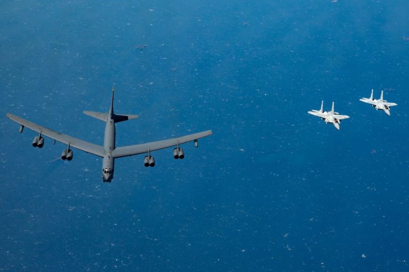 Un bombardier lourd B-52H Stratofortress survolant en formation avec des F-15 qataris les eaux du Golfe (Crédits: DVIDS)