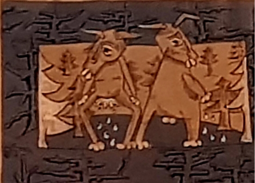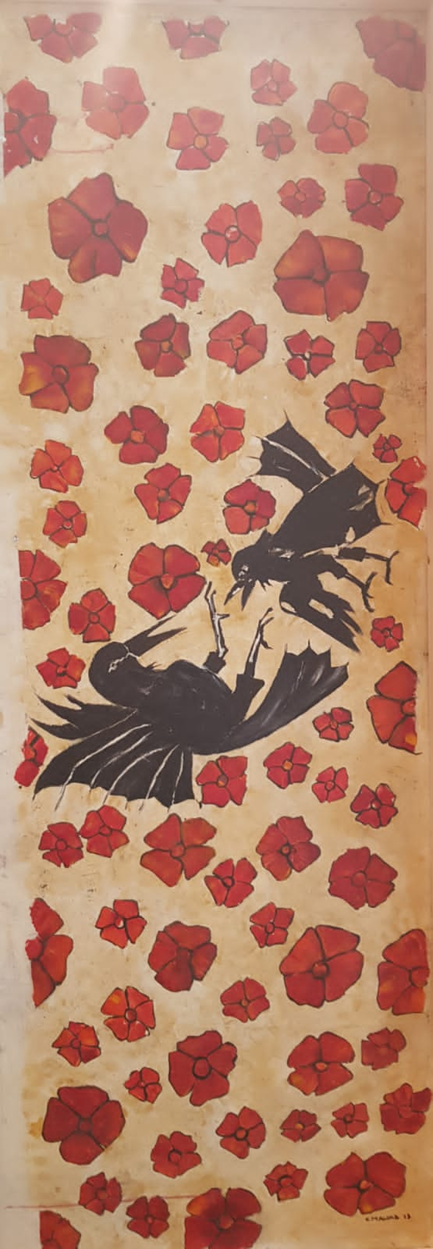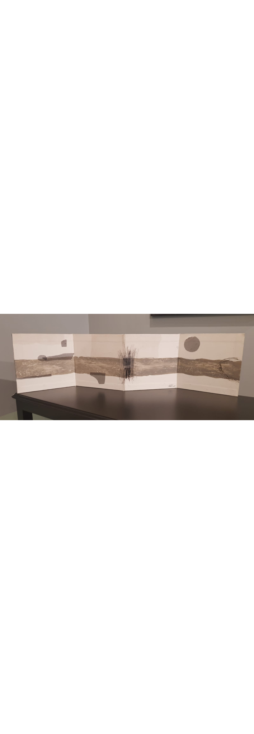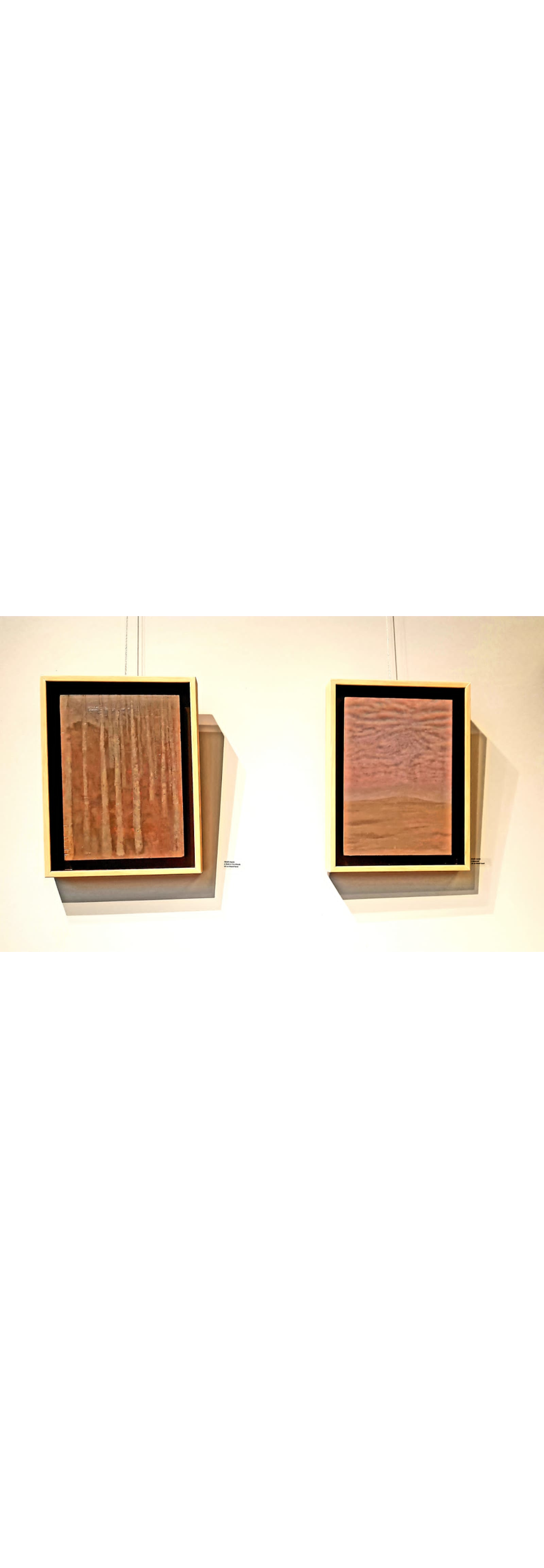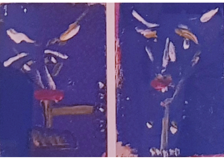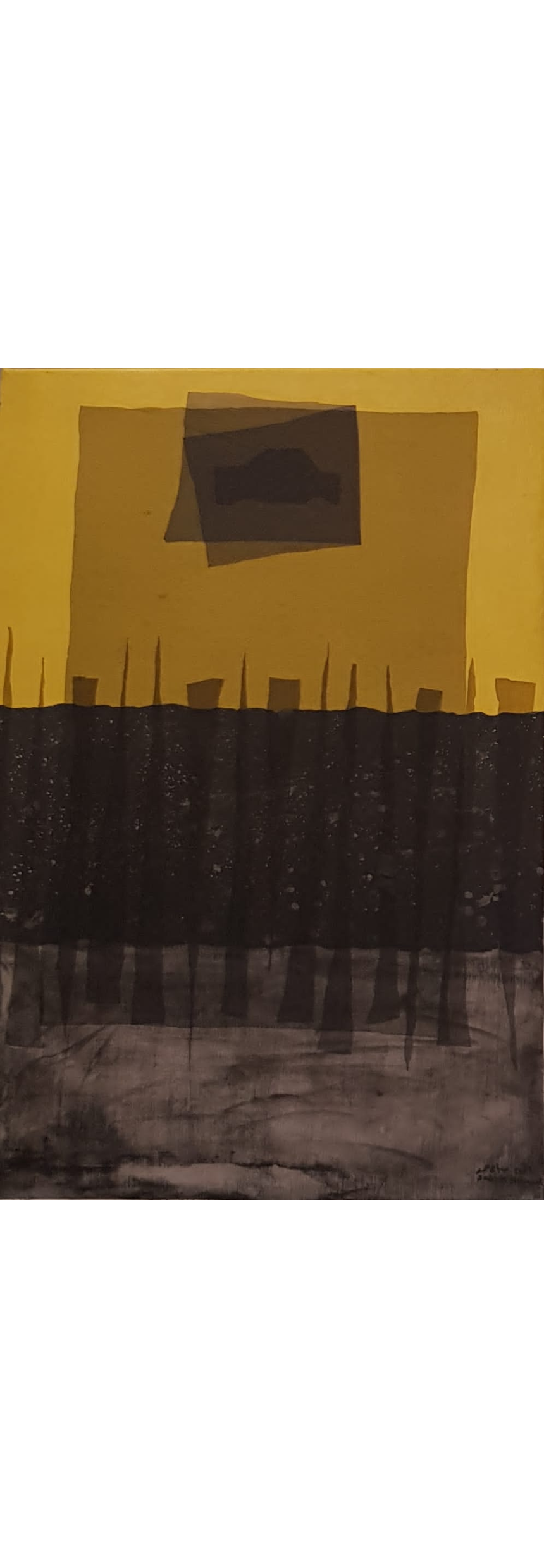 Dans une autre œuvre intitulée Le linteau et le corbeau, le peintre présente, à l’instar d’une fable, une pièce à double face tout en verticalité, posée sur le sol comme une porte sur un seuil pour rappeler, dès l’entrée, les valeurs orientales d’accueil et d’hospitalité, de chaleur humaine et de dignité, destinées – côté verso – à s’éteindre sous la menace du corbeau rapace prêt à les dévorer.