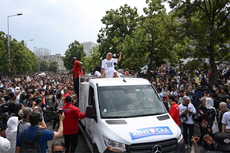 Mounia (C), la mère de Nahel, lors de la marche blanche organisée après la mort de son fils, dans le quartier Pablo Picasso de la banlieue parisienne de Nanterre, le 29 juin 2023.Un avocat de la famille, Yassine Bouzrou, a déploré que le procureur ait "occulté la possible complicité d'homicide volontaire du second policier et les possibles faux en écritures publiques résultant des déclarations mensongères initiales du tireur, qui avait formellement affirmé que le jeune Nahel avait tenté de lui foncer dessus avec le véhicule".