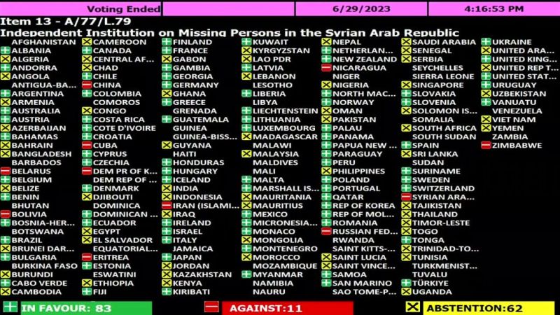 Les Etats membres ont donc décidé d'établir, "sous l'égide des Nations unies, l'Institution indépendante sur les personnes disparues de la République arabe syrienne, pour clarifier le sort et la localisation de toutes les personnes disparues" en Syrie.
