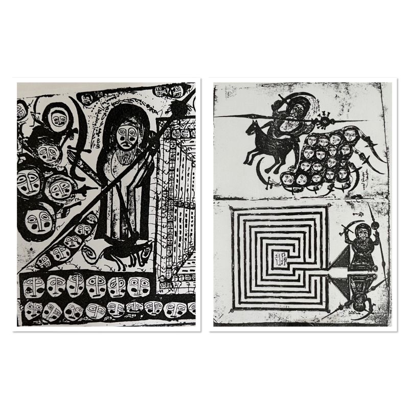 Les illustrations du rouleau protecteur se développent alors autour de la force expressive de l’œil angélique qui conjure le mauvais œil. Pour Jules Leroy, l’artiste éthiopien «n’a aucun respect de la réalité vraie de l’anatomie, n’hésitant pas… à mutiler la nature et à la plier à sa fantaisie». Il peint à larges traits, avec une stylisation hardie et inoubliable. Le regard est souligné, renforcé et exagéré jusqu’à la fascination que Jacques Mercier tente de définir comme une abolition de la perspective et sa substitution par un effet d’opposition entre le mobile et le statique. «L’image est centrée, écrit-il. Les cercles cadrent le champ du regard et celui-ci, par contraste, reste fixé sur les motifs centraux des yeux. Le dessin donne l’impression de bouger tout en étant fixe. Ce mouvement dans la fixité n’est autre que la fascination.»