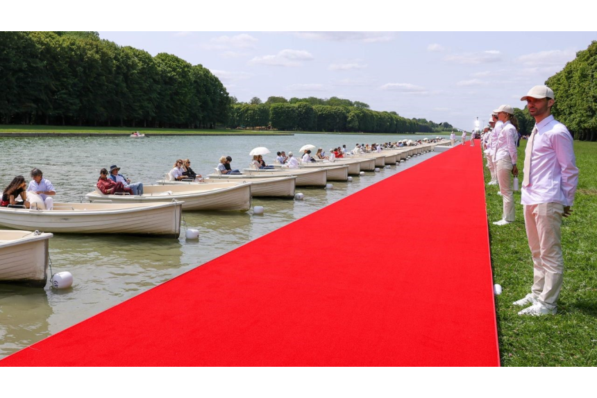 Dans un décor digne d'un tableau impressionniste, au bord du majestueux Grand Canal de Versailles, les invités embarquaient deux à deux à bord de barques pour assister à la révélation de la collection de Jacquemus. Tel que l'a exprimé Simon Porte Jacquemus après le défilé, l'objectif était de recréer une ambiance rappelant les peintures de l'impressionnisme. Et le résultat est saisissant: un cadre à la fois graphique et poétique, où le podium flamboyant se fond harmonieusement dans les étendues verdoyantes et les eaux paisibles, où les barques viennent s'amarrer.