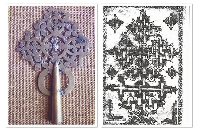 Deux croix à composition en losange. À gauche: croix éthiopienne de procession en cuivre avec extrémités en oiseaux. XIXe siècle. Photo Bibliothèque-musée Bar-Julius Liban. À droite: manuscrit syriaque de la bibliothèque nationale de Paris. Bibl. Nat. Syr. 70. Photo Jules Leroy.L’inscription guèze de Mar-Assia