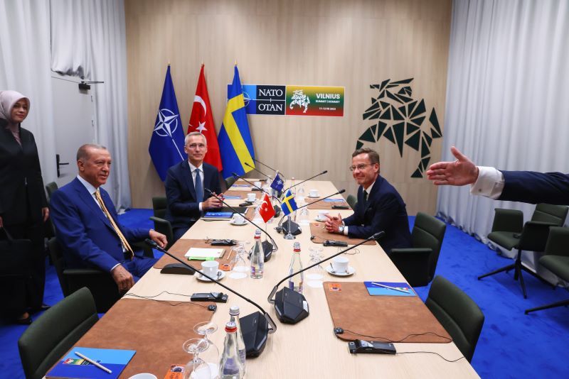 Le président turc Recep Tayyip Erdogan lors de sa réunion lundi avec le secrétaire général de l'Otan Jens Stoltenberg et le Premier ministre suédois Ulf Kristersson à Vilnius, en Lituanie, où se tiendra mardi et mercredi le sommet de l'Alliance atlantique. (AFP)Le Premier ministre suédois Ulf Kristersson a salué "un bon jour" pour son pays et un "très grand pas".
