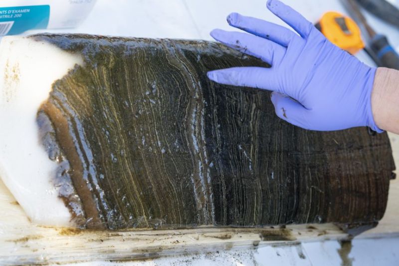 Prélèvement de sédiments dans les fonds du lac Crawford. Le 11 juillet 2023, le groupe de travail sur l'Anthropocène de la Commission internationale de stratigraphie a désigné le lac comme l'incarnation de l'époque Anthropocène proposée. (Photo Peter POWER / AFP)