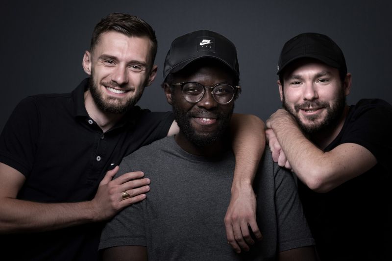 De gauche à droite: Quentin Mengual Mahmoud Gassama et Bruce Grannec animateurs du talk-show dédié au football "Hors-Jeu" posent lors d'une séance photo le 12 juin 2023. Crédit photo: Joël Saget/AFP