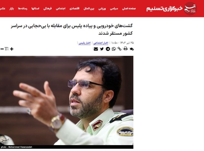 "La police, suivant les demandes du peuple (...) afin d'étendre la sécurité publique et renforcer les fondements de la famille, (...) et contribuer à la paix mentale de la société": lit-on en persan sur le site de l'agence Tasnim, citant le porte-parole de la police iranienne Saïd Montazeralmahdi. (Capture d'écran du site Tasnim)Mise en cause par les manifestants, la police des mœurs avait en bonne partie disparu des rues ces derniers mois. Et les femmes étaient de plus en plus nombreuses à sortir la tête non couverte, notamment à Téhéran et dans les grandes villes.