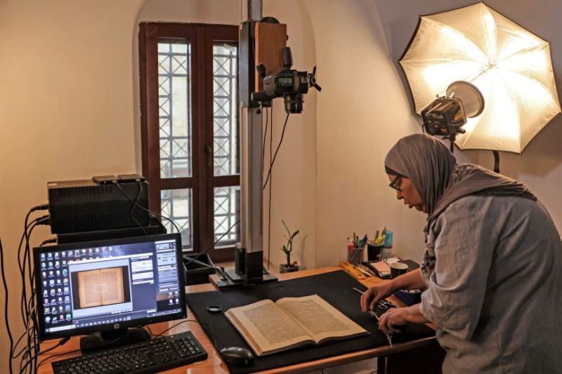 Crédit photo : Ahmad Gharabli / AFPShaimaa al-Budeiri, responsable des archives numériques, s'affaire à photographier les pages et à les télécharger sur son ordinateur. À ce jour, elle a numérisé près de 2,5 millions de pages de manuscrits, journaux, livres rares et autres documents issus des quatre bibliothèques privées de Jérusalem. Al-Budeiri rêve de recueillir davantage de fonds pour acquérir des équipements coûteux, comme des boîtes de stockage sans acide, et pour moderniser son atelier, trop humide pour manipuler un papier aussi délicat. "Si je vois quelqu'un maltraiter un livre, j'ai l'impression que le livre souffre", confie-t-elle. "Le livre vous donne des choses, il ne vous enlève rien."