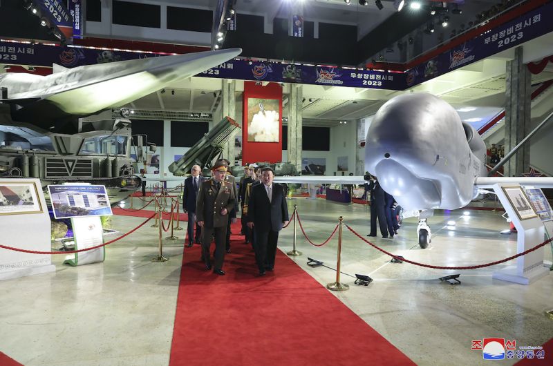 Cette photo prise le 26 juillet 2023 et publiée par l'Agence centrale de presse coréenne (KCNA) le 27 juillet montre le dirigeant nord-coréen Kim Jong Un (devant à droite) visitant l'exposition d'armes avec le ministre russe de la Défense Sergei Shoigu (devant à gauche) et des membres de la délégation militaire à Pyongyang. (Photo STR / KCNA VIA KNS / AFP)