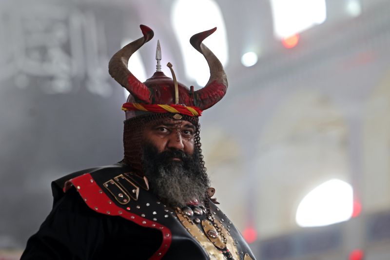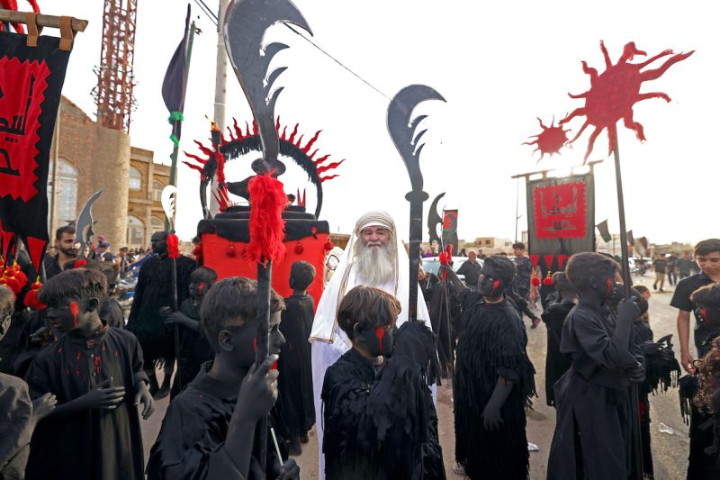 Des musulmans chiites participent au spectacle religieux annuel de Taazieh dans la ville iranienne de Noosh Abad, le 26 juillet 2023, pendant le mois musulman de Muharram qui précède l'Achoura. (Photo ATTA KENARE / AFP)Selon la légende, ces petits diables auraient assisté à la bataille de Kerbala et proposé leur aide à Hussein, qui aurait refusé en disant que son destin était de mourir sur le champ de bataille.