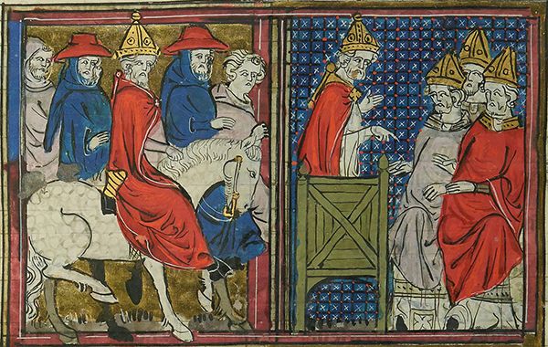 Urbain II prêchant la croisade en novembre 1095 au concile de Clermont. Miniature du XVᵉ siècle attribuée à Jean Fouquet (Bibliothèque Nationale de Paris in Herodote.net)La société des États latins