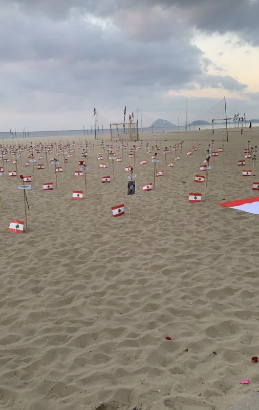 ©La plage de Copacabana à Rio de Janeiro (Brésil) où des drapeaux libanais et des fleurs ont été plantés dans le sable, au nom de chaque victime