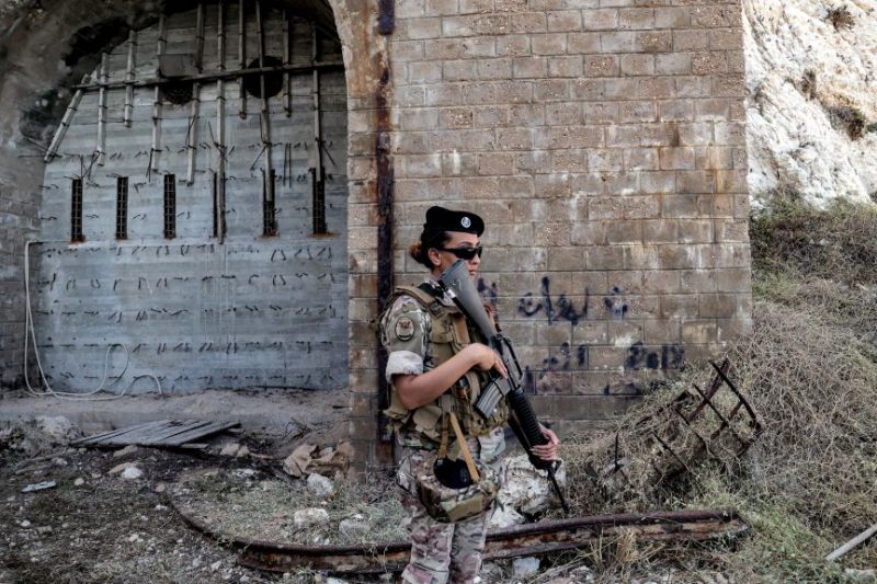 Près de Naqoura une soldate libanaise monte la garde près de l'entrée cimentée d'un tunnel ferroviaire qui assurait avant 1948 la liaison entre le Liban et la Palestine (Photo ANWAR AMRO / AFP)Durant la tournée, la délégation a témoigné d’une violation israélienne des eaux territoriales libanaises au niveau de Naqoura, a expliqué le général Chéhadé.