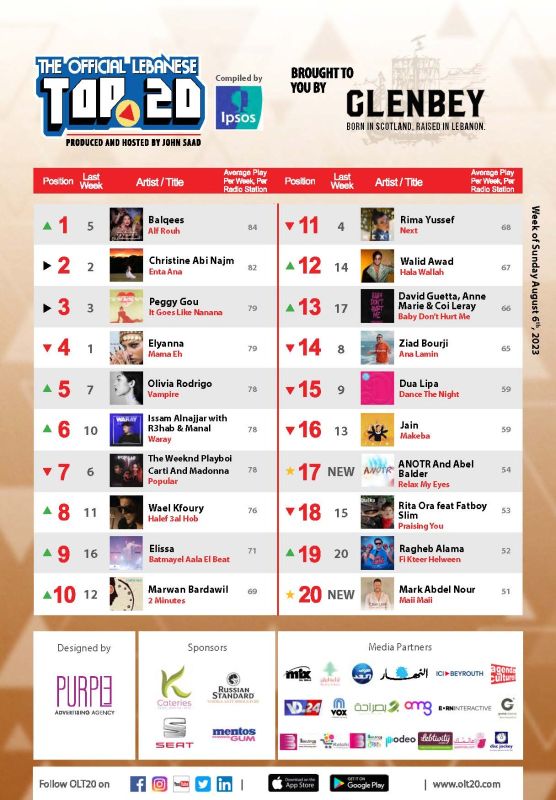 Cette semaine dans OLT20, on félicite la chanteuse et actrice émiratie Balqees Ahmed Fathi qui est, pour la première fois, en tête du Top libanais officiel avec son nouveau single, Alf Rouh. Depuis ses débuts dans le monde de la chanson, dès son plus jeune âge, elle a toujours su profiter des conseils de son père, Ahmed Fathi, un musicien yéménite de renom. Avec des millions de stream sur toutes les plateformes digitales et plus de six millions de vues sur YouTube, Balqees prouve qu’avec Alf Rouh, elle a trouvé la bonne formule. La chanson a été composée par Guy Manoukian et produite par Sleiman Damien. La vidéo a été réalisée par Élie Fahd. Il est aussi important de noter que, suite à une campagne marketing très efficace menée au Liban et dans le Golfe, la chanson est devenue l’un des tubes de l’été au niveau régional.