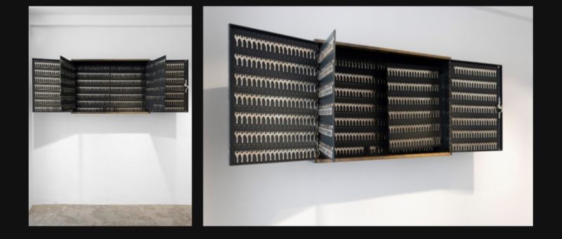 L’œuvre Mon(t) Liban – 200 x 75cm, 2020, métal, clés, sciure de clés, sonnettes d'un immeuble de Mar Mikhael – s'inspire de la capacité d'adaptation des Libanais pendant la guerre civile. Ils réalisaient des dizaines de doubles de leurs clés afin de permettre à chaque appartement de devenir un potentiel lieu de refuge.