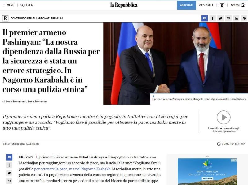 Dans une interview accordée à La Repubblica et relayée par Reuters, le Premier ministre arménien Nikol Pachinian a vivement critiqué la Russie pour avoir failli à remplir son rôle au Karabakh. Il a même affirmé que l'Arménie a commis une erreur stratégique en comptant uniquement sur Moscou pour assurer sa sécurité.