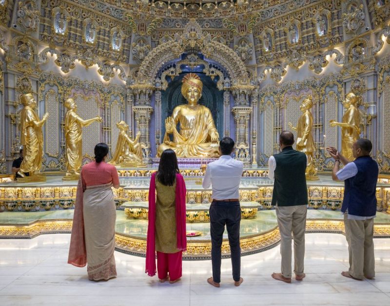 Le Premier ministre britannique Rishi Sunak (au centre) et son épouse Akshata Murty (2 à gauche) offrent des prières lors de leur visite au temple d'Akshardham. en marge du sommet du G20 à New Delhi le 10 septembre 2023. (AFP)