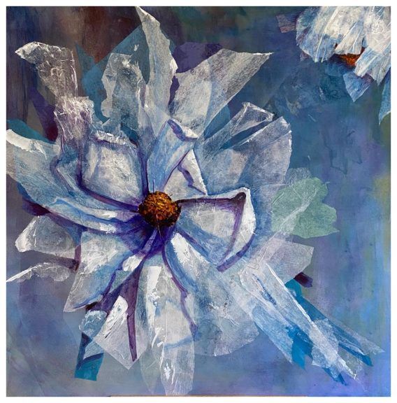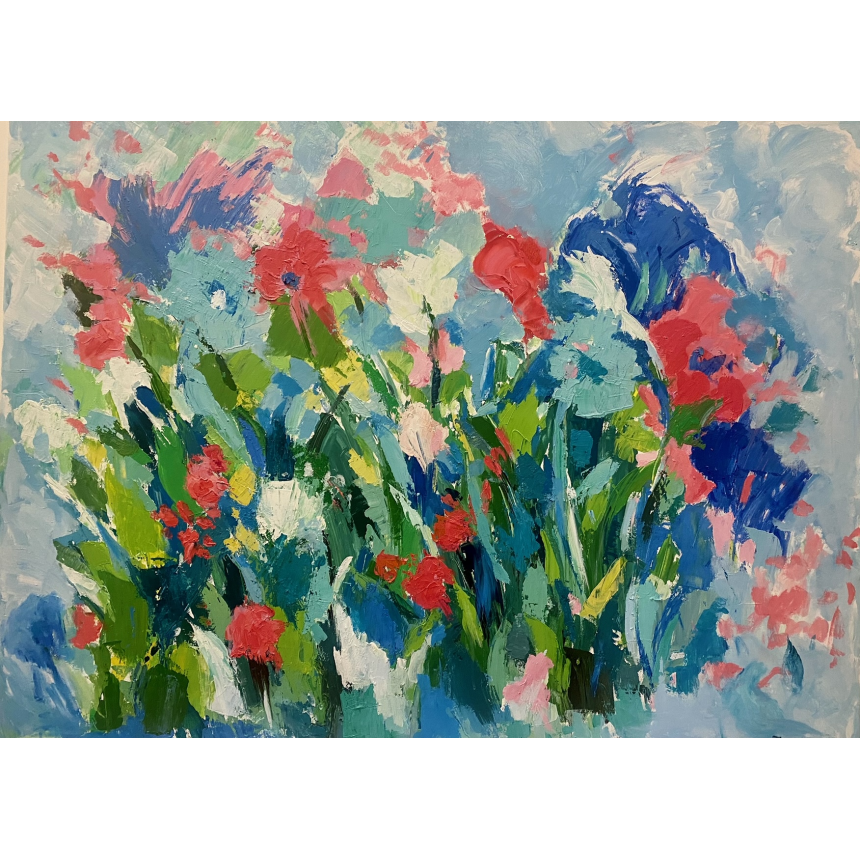 C’est avec l’artiste et avocate Jocelyne Ghannagé, que se clôture la visite. Les couleurs vives, qui signent habituellement ses toiles, viennent se composer sur une peinture vibrante de sensations florales. Un tableau peint avec les tripes qui dévoile la puissance du coup de pinceau de l’artiste